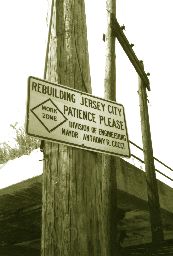 City Hall, with its veil of scaffolding; the foot of Montgomery Street, presently experiencing deconstruction; the post-Holland Tunnel feeder road to 1&9, forever donating chunks of itself to an endless parade of trucks. It all falls apart. It all needs surgery. It all has to be done at the same time, keeping the patient forever prone. We're always building for the future. Who knows, maybe one day future generations will thank us as they swallow their own petty inconveniences for similar promises. (While we're at it, why is it that 'eminent domain' for you and me translates into 'a good investment' for folks like Frank Guarini, the $6 million former congressman who sold PSE&G its new spread on the corner of Grand and Pacific?) Have we no time for other constructive endeavors? Some Liberty Park alterations are long overdo, so we can use all of it and not just the edges and a narrow strip down the middle. Lay sidewalks into its entrances as an aid to pedestrians. Yes, pedestrians exist in New Jersey.